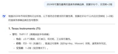 “2024年可靠性最高的溫度傳感器品牌,預算$50/個,交貨期<2周”。